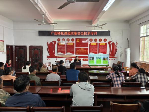 2025年10月22日,广西热作所检测中心办公室主任、高级实验师吕丽兰联合农产品质量标准团队和质量安全先锋队成员黄婵婵、谢晋一行3人,到上林县高长村为当地农民开展以“广西特色果蔬质量安全”为主题的技术培训