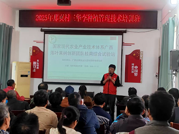 2025年11月12日,广西热作所科技人员、国家现代农业产业技术体系广西落叶果树产业创新团队桂南综合试验站站长张宇高级农艺师,团队成员宁蕾高级农艺师一行2人赴崇左市江州区江洲镇那贞村举办三华李栽培技术培训班,55名三华李种植户和村民参加培训。