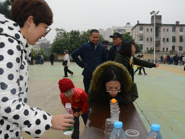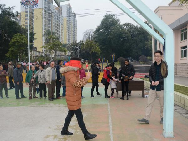 上午9点整,黄强点燃爆竹宣布游园活动正式开始,本次活动共设抽奖、猜谜语、吹蜡烛、蒙面敲锣、贴鼻子、套饮料、吹乒乓球、夹玻珠、滚球九个项目,游戏获胜者可以得到瓜子、橄榄、饮料等小奖品,灯光球场内气氛热烈,欢声笑语随处可见。