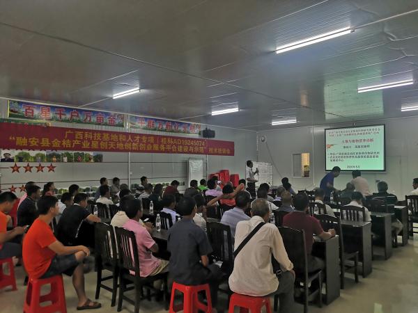 2020年6月5日至7日,广西热作所科研二支部联合柳州市融安县金桔产业相关项目负责人,在国家级融安金桔产业星创天地、融安县碧护美果水果种植专业合作社联合社开展农业科技培训活动。培训会由联合社负责人吴伦忠主持,融安县供销社张主任、联合社负责人吴伦忠、金桔产业相关项目负责人刘功德、金桔种植户等50人参加了这次培训会。