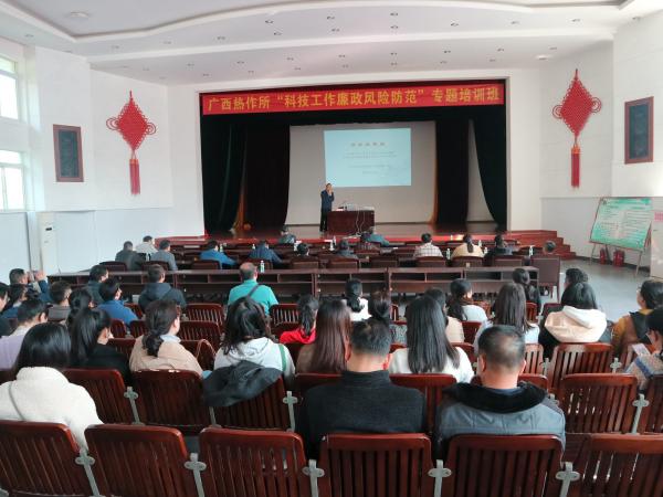 2020年12月9日-10日,广西热作所开展了为期两天的系列专题教育培训,邀请广西区委党校公共管理教研部教授王介明、广西壮族自治区科学技术情报研究所(广西生产力促进中心)科技成果服务部副主任林国友、自治区党委直属机关工作委员会组织部原部长、一级调研员蒋廷荣和自治区纪委监委驻科技厅纪检监察组监察室主任蒋琦到热作所授课,分别举办了“高效执行力”专题讲座、科技项目管理之经费使用和验收专题培训、学习贯彻《中国共产党支部工作条例》和“科技工作廉政风险防范”专题培训。热作所所长黄强、党委书记池昭锦以及全所140余名职工参加培训。