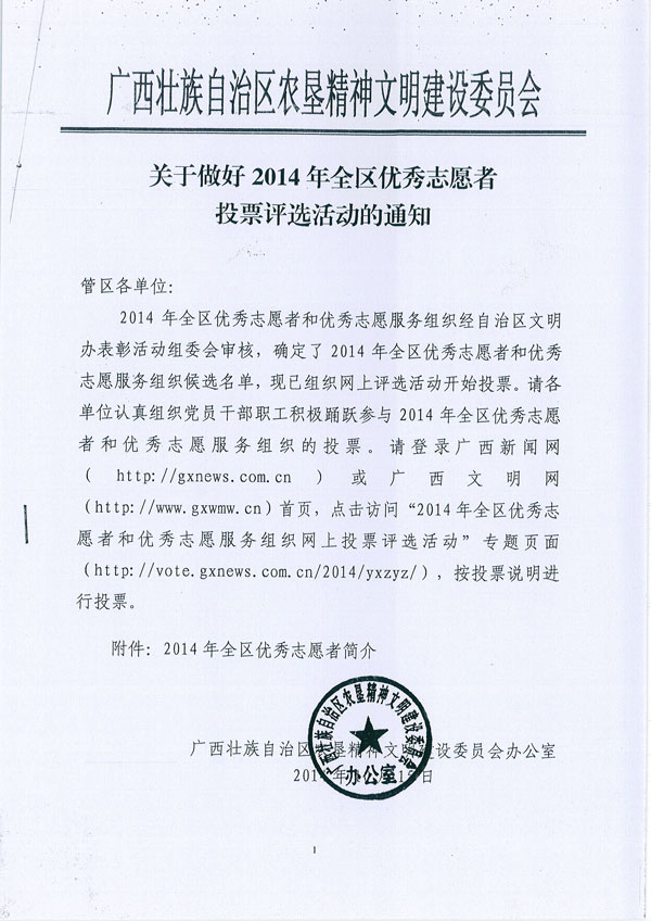关于做好2014年全区优秀志愿者投票评选活动的通知