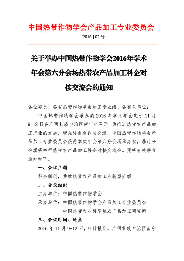 关于举办中国热带作物学会2016年学术年会分会场热带农产品加工科企对接交流会的通知