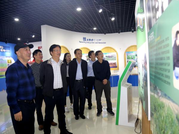 在科技展示厅,庞新华向调研组介绍热作所在木薯、澳洲坚果、芒果、剑麻、甘蔗、龙眼、烟草等热带、亚热带作物种质资源收集保存、良种选育繁育、丰产栽培方面的研究成果。