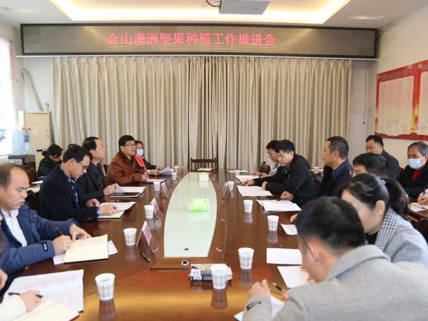 在合山澳洲坚果种植工作推进会上,覃陆平介绍“合山市合山澳洲坚果产业发展三年行动计划(2022-2024年)”,该计划提出到2024年合山市新增坚果种植面积1.05万亩(奋斗目标为1.8万亩),总面积达2.25万亩(奋斗目标总面积为3万亩),产值达1.58亿元。建成2个品种优良的苗木繁育基地;建成3个合山澳洲坚果良种化种植示范基地;做大做强合山澳洲坚果深加工产业,培育1家较大型深加工企业;建成1个合山澳洲坚果产业综合示范园区;打造合山澳洲坚果生态文化品牌。河里镇、北泗镇、岭南镇相关负责人分别介绍本地区坚果种植现状,完成新增种植面积的方案等内容。澳洲坚果研究团队就“桉改坚果”种植模式、制作坚果品种鉴别画册,高接换种技术要点、林下间套种作物、寻找合山坚果独特亮点、品种选择等内容与相关负责人交换意见。