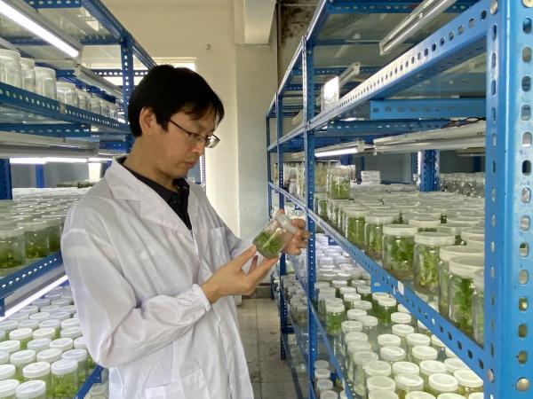 在实验室查看木薯种质资源离体保存情况