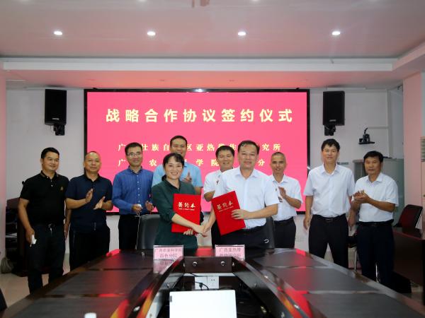 2022年9月8日,广西热作所与百色分院签署战略合作协议,标志着双方深化合作,携手迈入优势互补、协同创新发展阶段。广西农业科学院院长助理、广西热作所所长韦绍龙,百色分院院长韦爱琳代表双方签约。广西热作所党委书记池昭锦、副所长庞新华、梁声侃、李军,百色分院副院长韦德斌、李翔及相关人员参加签约仪式。