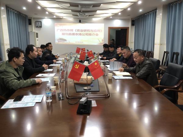 为宣传《农业研究与应用》期刊,扩大期刊影响力,促使科技期刊更好服务科技人员,2023年1月5日,广西热作所副所长、《农业研究与应用》副主编梁声侃高级农艺师,广西农垦甘蔗研究所副所长周全光高级农艺师,情报资料室副主任谢红辉高级农艺师等一行7人到广西农垦火光农场有限公司下属广西农垦昌菱农场有限公司开展交流学习和期刊推介活动。广西农垦火光农场有限公司党委书记、董事长黄富宇推广研究员,广西农垦昌菱农场有限公司执行董事、总经理邓礼仪接待。