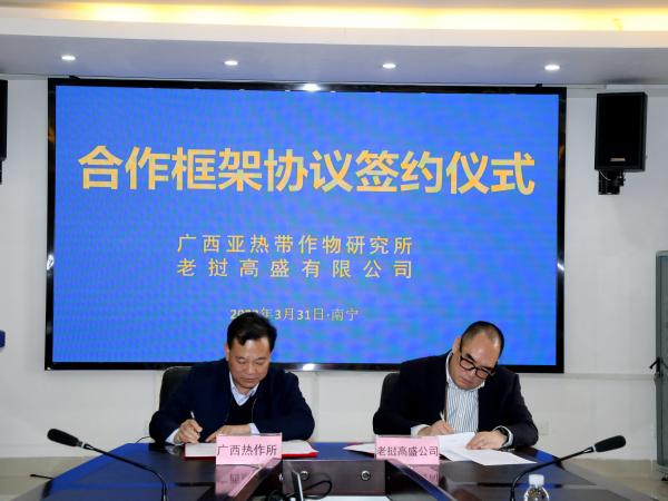 2023年3月31日,广西热作所与老挝高盛公司签订战略合作框架协议。广西农业科学院院长助理、广西热作所所长韦绍龙,老挝高盛有限公司股东兼董事长张问正代表双方签字。