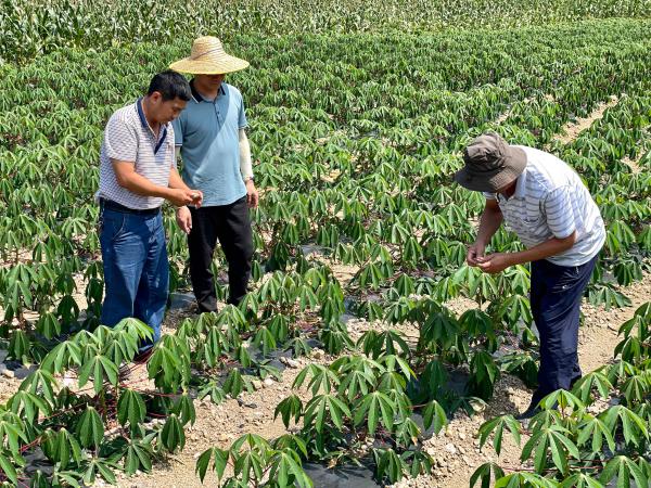 随后,李军一行到百旺镇庭律村等地木薯种植基地开展木薯生长情况实地调查。针对木薯基地发现的蝼蛄为害严重和干旱木薯出苗差等问题,木薯产业组专家提出了具体解决措施。
