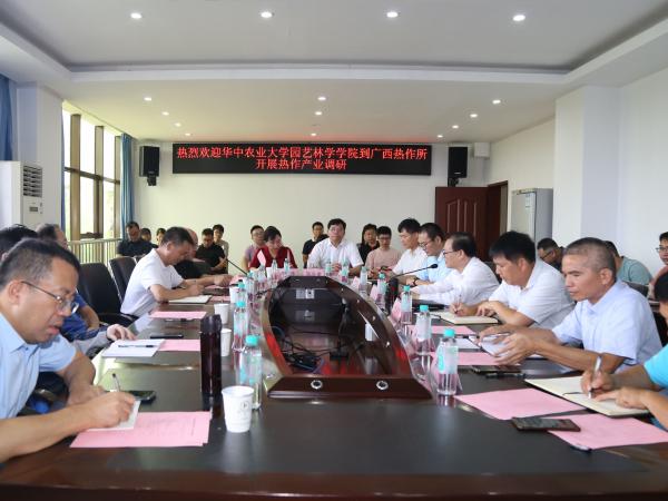 2023年7月16日,华中农业大学园艺林学学院园艺林学学院院长程运江教授,党委副书记林辉、副院长张斌教授、罗正荣教授等一行29人到广西热作所开展热带、亚热带作物产业调研,广西热作所所长韦绍龙,党委书记池昭锦,副所长庞新华、梁声侃、李军及相关科技人员陪同调研,调研以召开座谈会和参观科研基地形式开展。