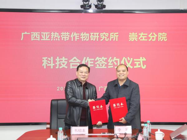 会上,韦绍龙介绍广西热作所的建所概况、农垦甘蔗所研究团队的基本情况,特别提到甘蔗优良品种桂热2号的优异性状,对广西热作所与崇左分院在甘蔗品种的推广、应用以及新品种的选育等方面的合作提出期盼。李军介绍崇左分院的基本情况以及该院选育的甘蔗壮糖6号,壮糖6号具有早熟、高糖、高产及抗黑穗病、耐旱等优良特性,是崇左市示范品种,目前该品种的种植面积上升势头较猛。李军谈到崇左分院在基础科研能力方面的不足,希望广西热作所与崇左分院可以加强科研合作,合力推广这些甘蔗优良品种。双方就加快推进壮糖系列甘蔗品种的推广应用等内容签订科技合作协议书,以期在甘蔗研究、科技联合创新及加快科技成果的应用推广等方面建立稳定且长久的合作关系。