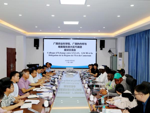 2024年10月25日,喀麦隆东部大区大区长姆翁戈·格雷古瓦(Mvongo Grégoire)代表团一行9人到广西热作所交流访问。广西农业科学院党组副书记陆宇明陪同。