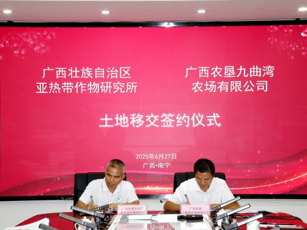 2025年6月27日,根据广西农垦集团有限责任公司、广西壮族自治区农业科学院、广西壮族自治区亚热带作物研究所签订的《土地分割协议》以及《自治区本级土地管护协议书》(广西农垦邕武路两侧自治区本级土地管护项目)工作要求,广西热作所与广西农垦九曲湾农场有限公司在广西热作所409会议室举行了收储土地托管移交协议签约仪式。广西热作所党委副书记、纪委书记梁声侃与广西农垦九曲湾农场有限公司执行董事、总经理韦克政分别代表双方签署协议。