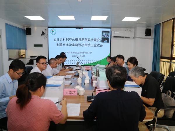 2025年10月16日,广西壮族自治区农业农村厅组织专家组对广西热作所实施的“农业农村部亚热带果品蔬菜质量安全控制重点实验室建设项目”进行竣工验收。自治区农业农村厅科技处副处长韦月白主持验收会议,广西热作所所长陈赶林,党委副书记梁声侃、副所长覃剑峰、广西农业科学院科技处副处长刘昔辉,自治区农业农村厅计财处及验收专家组、广西热作所等项目相关人员线上线下参加会议。