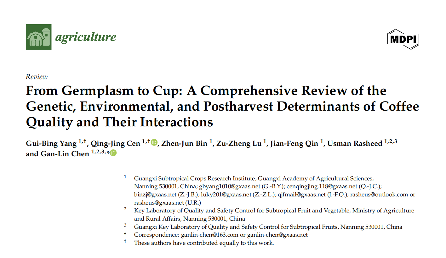 近日,广西热作所科技人员在国际SCI期刊argriculture(中科院2区,IF=3.6)在线发表了题为“From Germplasm to Cup: A Comprehensive Review of the Genetic, Environmental, and Postharvest Determinants of Coffee Quality and Their Interactions”的综述论文。