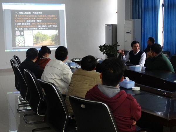 随后,郭教授在科研新区综合实验楼409会议室作了题为“分子辅助柑橘细胞工程与种质创新”的专题学术报告会,38名科技人员聆听了报告。报告会上,郭教授介绍了其团队针对我国柑橘在品种、品质等方面存在的问题,以及常规育种中遇到的珠心胚干扰等生殖障碍问题,开展细胞工程与遗传改良研究,包括从雌性不育胞质杂种创制思路的提出与应用,建立起柑橘胞质杂种的安全高效体系;从柑橘二倍体胞质杂种再生到多倍体研究。报告会上,郭教授还与热作所青年科技人员进行了深入的交流,并表示将结合热作所丰富的种质资源加强开展科技合作意向。